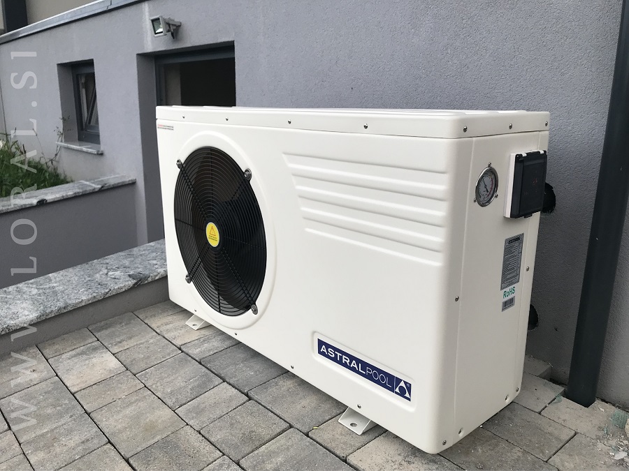- toplotna črpalka - deluje na principu zrak voda, pomeni da jemlje toploto zraku in jo daje bazenski